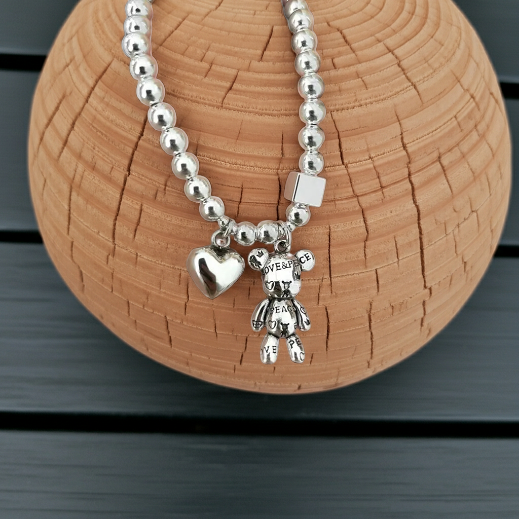 Un bracciale tenero e luminoso in argento 925, arricchito da una fila di perle e un piccolo ciondolo orsetto dal fascino vintage. Disegnato per chi ama i dettagli dolci e i gioielli che raccontano un ricordo.