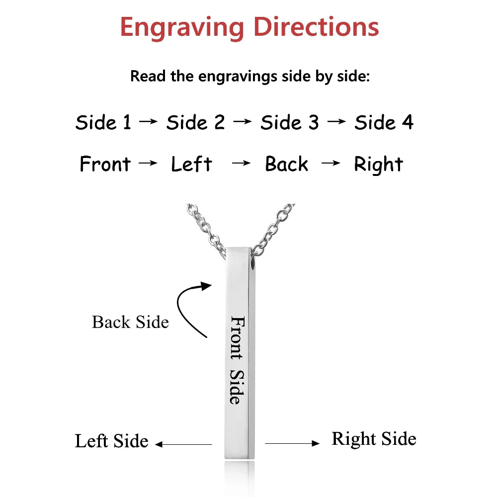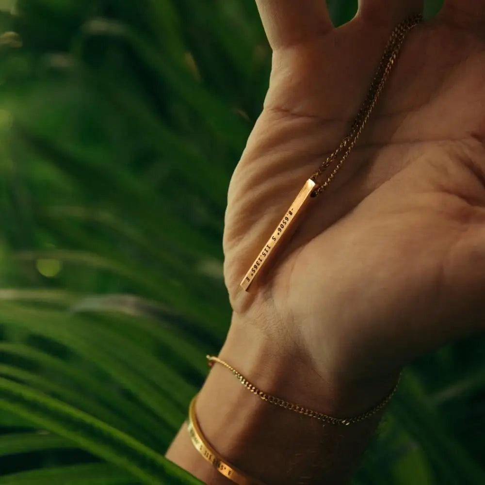 Questa collana con pendente a barra in acciaio inossidabile è completamente personalizzabile: puoi incidere un nome, una data speciale o le coordinate GPS di un luogo significativo. Un gioiello minimalista, elegante e profondo, perfetto per coppie, famiglie e momenti che vuoi custodire per sempre.